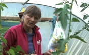 Bunty explains the importance of keeping your weeds down to prevent slugs and demonstrates more hoeing. She sows cabbage 'Duncan' and pulls up all the onions 'Red Baron', 'Hercules' & 'Stetton' laying them out to dry. She does the same to garlic 'Lautrec Wight' and then demonstrates why you leave legumes roots in the soil (all beans and peas) when clearing the crop. Bunty also tops the blighted potato follage and earths up to protect the crop from daylight. She harvests dwarf French beans 'Purple Tepee', vegetable spagetti, climbing French bean 'Cobra', fennel 'Florence', Chinese cabbage 'Nikko' and white radish 'Minnowase'. Bunty picks the early sweetcorn 'Lark' for eating and recycles the cobs as slug bait after dark.